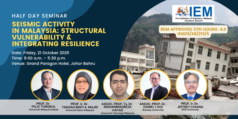 21 november 2025ONE DAY SEMINAR ON SEISMIC ACTIVITY IN MALAYSIA: STRUCTURAL VULNERABILITY AND INTEGRATING RESILIENCE READ MORE